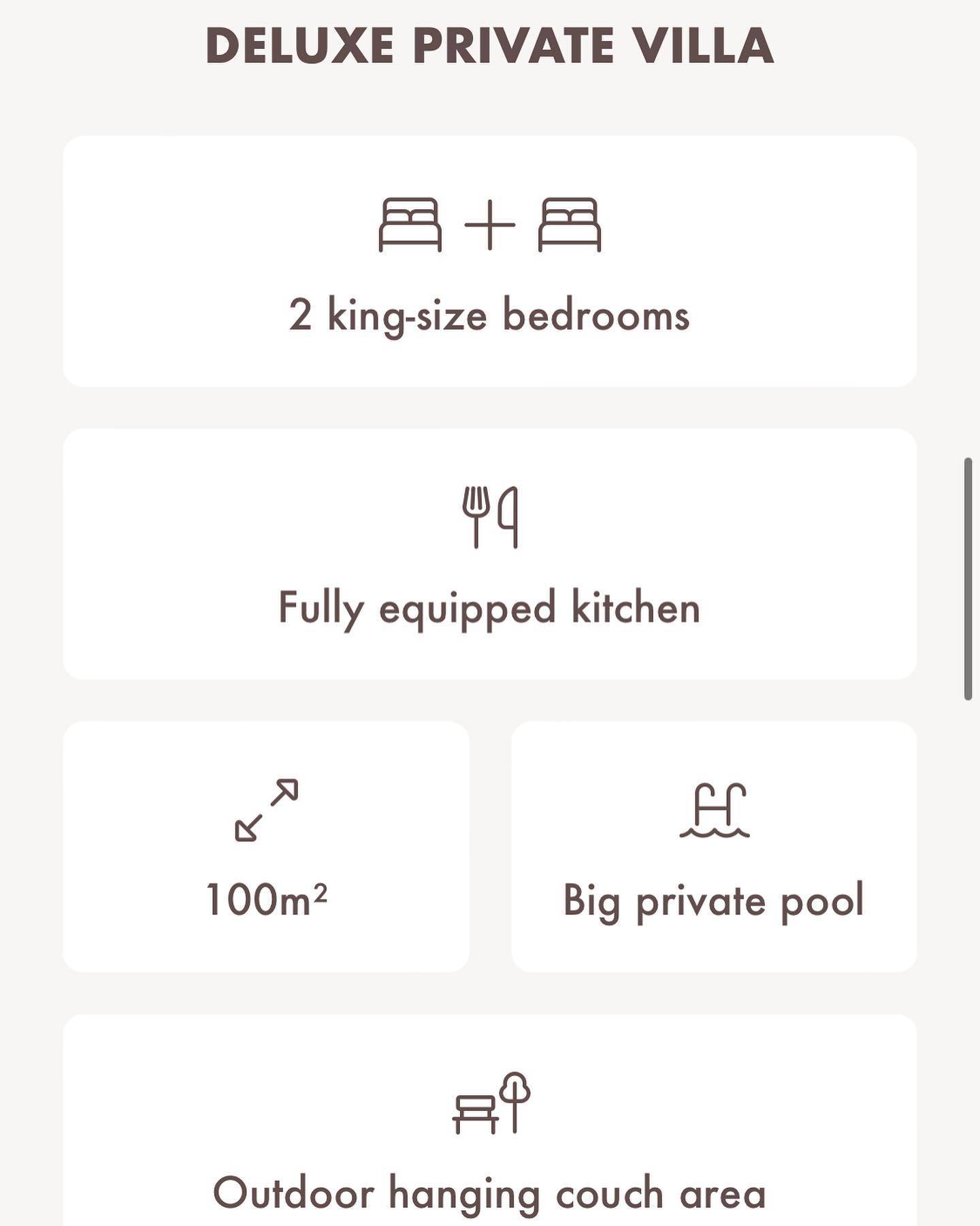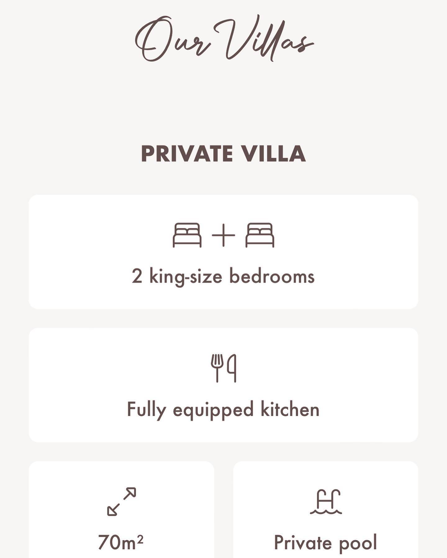 You’ll find yourself in the lap of luxury, with each Villa meticulously designed to provide the utmost comfort and convenience. The Private Villas feature two king-sized bedrooms, a fully-equipped kitchen, and a private pool, perfect for unwinding with loved ones. For an enhanced experience, the Deluxe Private Villas offer a bigger pool and an outdoor hanging couch area, ideal for basking in the tropical ambiance.