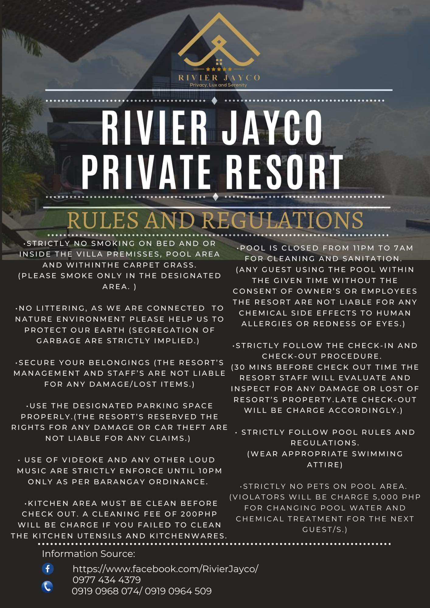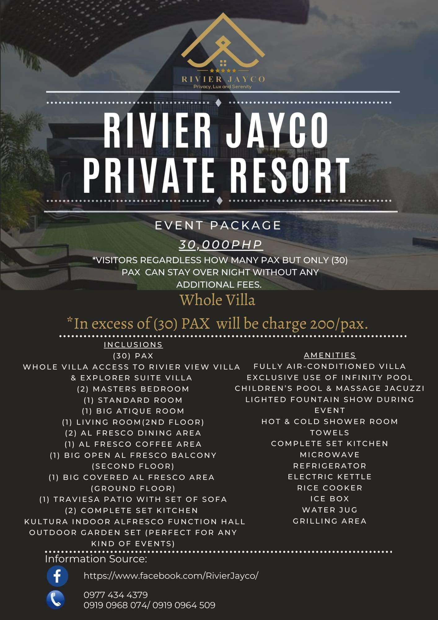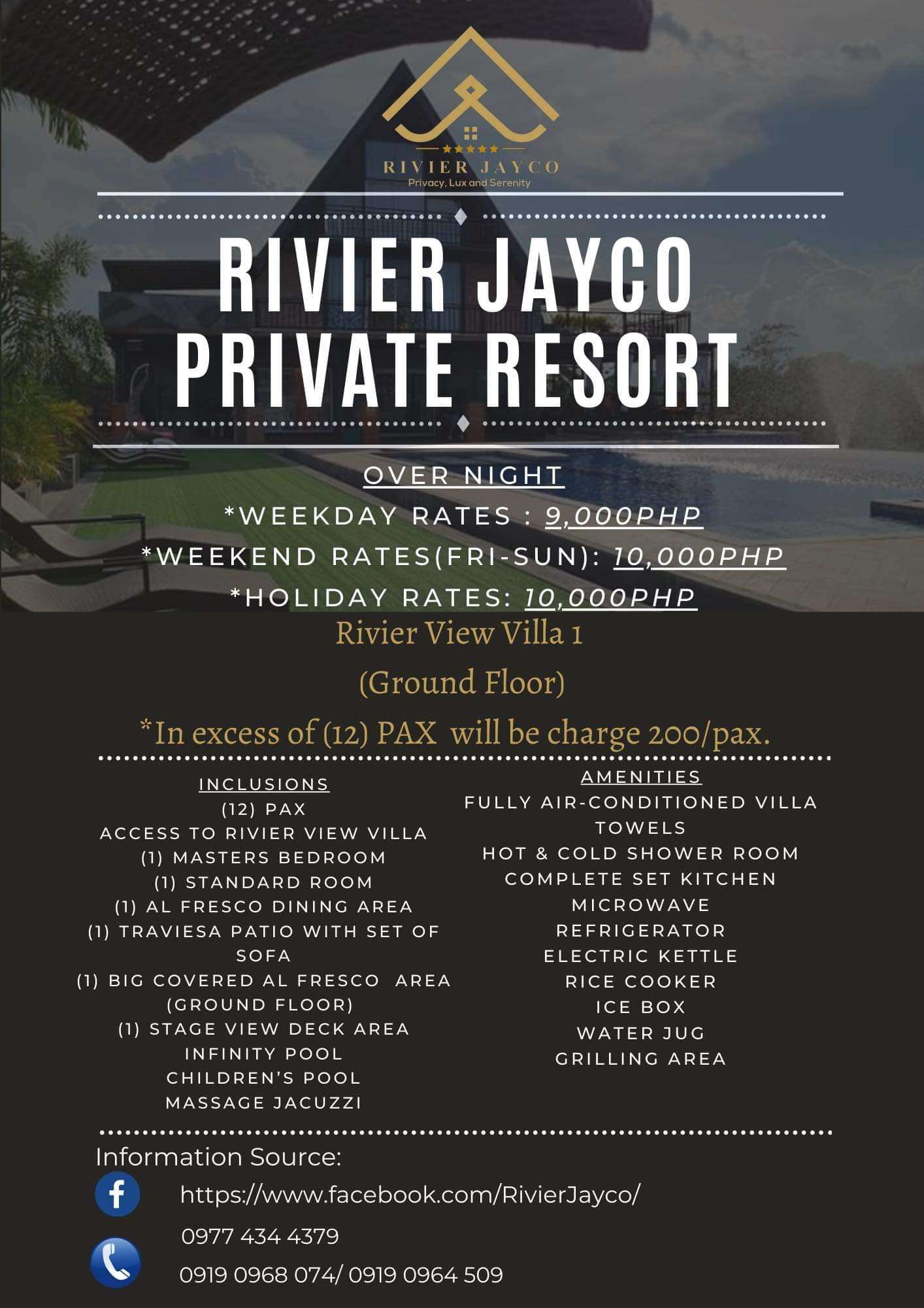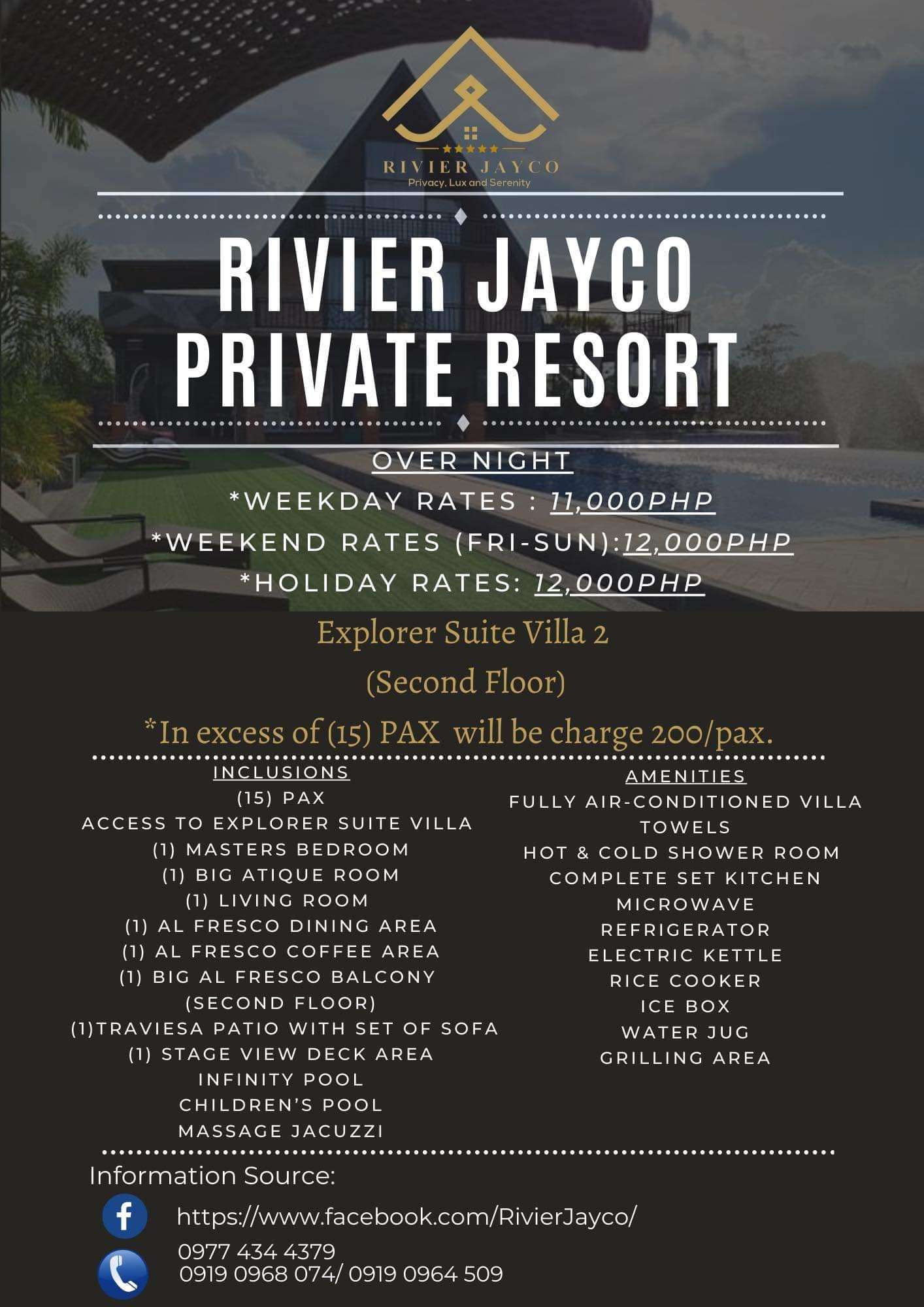 Welcome to Rivier Jayco, a luxurious staycation nestled in the heart of Batangas, Philippines. This breathtaking vacation spot boasts two stunning villas, the Rivier View Villa and the Explorer Suite Villa, perfect for families, friends, and events.